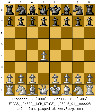 Last move : 1-0 2010 August 16 18:25:50 [Event "FICGS__CHESS__WCH_STAGE_1_GROUP_01__000008"] [Site "FICGS"] [Date "2010.08.13"] [Round "1"] [White "Fransson,Claes"] [Black "Guralivu,Paul-Iosif"] [Result "1-0"] [WhiteElo "1800"] [BlackElo "1385"] 1.d4 1-0 Queen's pawn Player White won this chess game. Follow this game move after move (download)Chess is really ninety nine percent calculation. (Soltis) Im Schach gibt es keinen Platz für Galanterie. (Irving Chernev) Una buena ofensiva y una buena defensa, comienzan ambas con un buen desarrollo. (Bruce A. Moon) Des idées, des idées, j'en ai cent, j'en ai mille. Des bonnes, des mauvaises, applicables, irréalisables... Il suffit de faire le tri ! (Roos) All war is based on deception. (Sun Tzu)