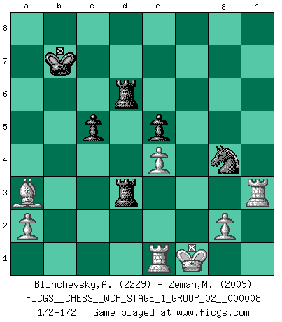 Last move : 1/2-1/2 2011 January 4 10:59:7 [Event "FICGS__CHESS__WCH_STAGE_1_GROUP_02__000008"] [Site "FICGS"] [Date "2010.08.13"] [Round "1"] [White "Blinchevsky,Alexander"] [Black "Zeman,Martin"] [Result "1/2-1/2"] [WhiteElo "2229"] [BlackElo "2009"] 1.d4 Nf6 2.c4 g6 3.Nc3 Bg7 4.e4 d6 5.Be2 e5 6.dxe5 dxe5 7.Qxd8+ Kxd8 8.f4 Be6 9.Nf3 Nfd7 10.O-O exf4 11.Bxf4 Bxc3 12.bxc3 Na6 13.Nd4 Nac5 14.Rad1 Rc8 15.Rb1 a6 16.Bh6 Ke8 17.Nxe6 fxe6 18.Rf3 Rg8 19.Re1 Ne5 20.Rh3 g5 21.Rg3 g4 22.Bf4 Ncd7 23.h3 h5 24.hxg4 Nxg4 25.Rh3 e5 26.Bg3 Ndf6 27.Bh4 Rd8 28.Rf3 Rg6 29.Bd3 Kd7 30.Ref1 Kc8 31.c5 Kb8 32.c6 Rd6 33.cxb7 Kxb7 34.Re1 a5 35.Re2 Rb6 36.Rf1 a4 37.Rf5 a3 38.Bg5 Nd7 39.Bc1 Nc5 40.Bc2 Rgc6 41.Rxh5 Nd3 42.Bxd3 Rxc3 43.Re1 Rxd3 44.Rh3 Rbd6 45.Kf1 c5 46.Bxa3 1/2-1/2 King's Indian : 5.Be2 Kingside Castling by player White (move 10) This chess game ended in a draw. Follow this game move after move (download)A great player and a great example for many. His book My 60 Memorable Games had a big impact on me. It is a shame he didn't continue to enrich the world of chess with his unparalleled understanding after 1972. (Jan Timman, about Bobby Fischer's death) Ich bin es gewohnt, das die Jugend mir überhaupt keinen Respekt entgegenbringt. (Alexander Morozewich) La estratégia requiere pensar, la táctica requiere observación. (Max Euwe) Les échecs, c'est l'art d'analyser. (Mikhail Botvinnik) Winning isn't everything... but losing is nothing. (Mednis)
