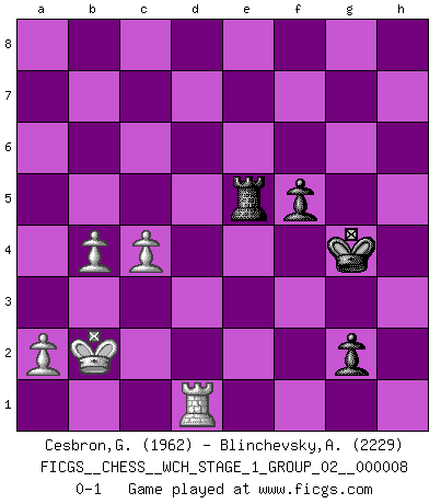 Last move : 0-1 2010 October 7 12:59:57 [Event "FICGS__CHESS__WCH_STAGE_1_GROUP_02__000008"] [Site "FICGS"] [Date "2010.07.02"] [Round "1"] [White "Cesbron,Guy"] [Black "Blinchevsky,Alexander"] [Result "0-1"] [WhiteElo "1962"] [BlackElo "2229"] 1.e4 c6 2.d4 d5 3.Nd2 dxe4 4.Nxe4 Bf5 5.Ng3 Bg6 6.h4 h6 7.Nf3 Nd7 8.h5 Bh7 9.Bd3 Bxd3 10.Qxd3 e6 11.Bf4 Qa5+ 12.Bd2 Bb4 13.c3 Be7 14.c4 Qc7 15.O-O-O Ngf6 16.Kb1 O-O 17.Ne4 Rad8 18.Nxf6+ Nxf6 19.Qe2 c5 20.g4 cxd4 21.g5 d3 22.Qe1 hxg5 23.h6 g6 24.Bxg5 Ng4 25.Qc3 e5 26.Nxe5 Nxe5 27.Bxe7 Qxe7 28.f4 Rfe8 29.Rhe1 Qc5 30.fxe5 Qd4 31.Qxd4 Rxd4 32.b3 Kh7 33.Kb2 d2 34.Re2 f6 35.Rexd2 Rxd2+ 36.Rxd2 Rxe5 37.Rd7+ Kxh6 38.Rxb7 g5 39.Rxa7 g4 40.Ra6 Kg5 41.b4 g3 42.Ra7 Kg4 43.Rd7 g2 44.Rd1 f5 0-1 Caro-Kann : 3.Nd2 Queenside Castling by player White (move 15) Kingside Castling by player Black (move 16) 10 pieces endgame at move 38 : White KRPPP , Black KRPPP WHITE : King + 1 Rook 3 Pawns BLACK : King + 1 Rook 3 Pawns 9 pieces endgame at move 39 : White KRPPP , Black KRPP WHITE : King + 1 Rook 3 Pawns BLACK : King + 1 Rook 2 Pawns Player Black won this chess game. Follow this game move after move (download)Chess is thirty to forty percent psychology. You don't have this when you play a computer. I can't confuse it. (Judith Polgar) Du kannst im Schach nur gut werden, wenn du das Spiel liebst. (Robert James Fischer) No solamente yo pronostico su triunfo sobre Botvinnik, sino que me adelanto y digo que probablemente Fischer es el jugador de Ajedrez mas grande que haya existido. (John Collins) Les échecs sont un jeu par leur forme, un art par leur essence et une science par sa difficulté d'acquisition. Ils peuvent vous procurer autant de plaisir qu'un bon livre ou une belle musique, mais vous n'aurez une réelle joie que si vous arrivez à bien jouer. (Tigran Petrosian) The man who strikes first admits that his ideas have given out. (Chinese proverb)