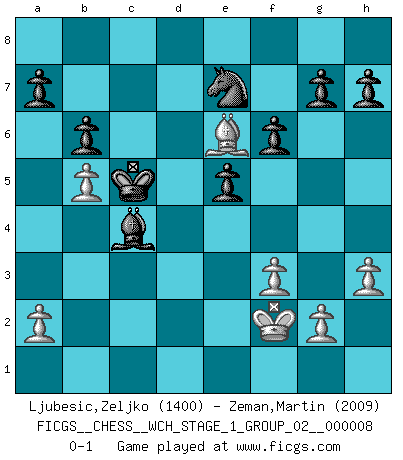Last move : 0-1 2010 November 12 16:43:50 [Event "FICGS__CHESS__WCH_STAGE_1_GROUP_02__000008"] [Site "FICGS"] [Date "2010.08.13"] [Round "1"] [White "Ljubesic,Zeljko"] [Black "Zeman,Martin"] [Result "0-1"] [WhiteElo "1400"] [BlackElo "2009"] 1.e4 c5 2.Nf3 d6 3.Bc4 Nf6 4.d3 e6 5.O-O Nc6 6.c3 Be7 7.h3 d5 8.Bb3 dxe4 9.dxe4 Qxd1 10.Rxd1 Nxe4 11.Nbd2 Nxd2 12.Bxd2 Bd7 13.Be3 b6 14.Rd2 O-O-O 15.Rad1 Na5 16.Ne5 Be8 17.Rxd8+ Bxd8 18.Bc2 Bc7 19.Bf4 f6 20.Nd3 c4 21.Bxc7 cxd3 22.Bxd3 Kxc7 23.b4 Nc6 24.Bc4 e5 25.Be6 Ne7 26.c4 Ba4 27.Rd2 Rd8 28.Rxd8 Kxd8 29.b5 Kc7 30.Kf1 Kd6 31.Bg4 Kc5 32.Be6 Bc2 33.f3 Bd3+ 34.Kf2 Bxc4 0-1 Sicilian Kingside Castling by player White (move 5) Queenside Castling by player Black (move 14) Player Black won this chess game. Follow this game move after move (download)We must make sure that Chess will not be like a dead language, very interesting, but for a very small group. (Sytze Faber) Ja, jede Frau in Holland liebt mich bestimmt, und alle Männer hassen mich. (Loek van Wely) Uno por uno, yo los acribillé, mi superioridad muy pronto se volvio aparente. (Jose Capablanca) Les Echecs mettent en conflit, non pas deux intelligences, mais deux volontés. (Lasker) Optimism is a variety of information deficit. Sometimes especially true for correspondence chess games. (Michael Aigner)