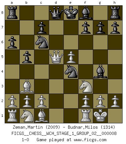 Last move : 1-0 2010 September 10 14:28:23 [Event "FICGS__CHESS__WCH_STAGE_1_GROUP_02__000008"] [Site "FICGS"] [Date "2010.08.13"] [Round "1"] [White "Zeman,Martin"] [Black "Budnar,Milos"] [Result "1-0"] [WhiteElo "2009"] [BlackElo "1314"] 1.e4 e5 2.Nf3 Nc6 3.Bb5 a6 4.Ba4 Nf6 5.O-O Nxe4 6.d4 b5 7.Bb3 d5 8.dxe5 Bg4 9.Qxd5 1-0 Ruy Lopez : Open, 7.Bb3 Kingside Castling by player White (move 5) Player White won this chess game. Follow this game move after move (download)Whoever sees no other aim in the game than that of giving checkmate to one's opponent will never become a good Chess player. (Euwe) Die Leute spielen gegen mich seit 15 Jahren unter Ihren Möglichkeiten. (Robert James Fischer) Si no le temes a Spassky, entonces elimino el elemento del dinero. (Jim Slater) Même si vous avez un bon coup à faire, regardez toujours s'il n'y en a pas un qui lui soit préférable. (Pedro Damiano) 'preceded by its own quotation yields a falsehood' preceded by its own quotation yields a falsehood. (W. V. O. Quine - Set Theory And Its Logic, 1953)