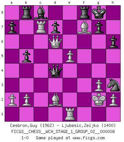Last move : 1-0 2010 September 15 9:48:51 [Event "FICGS__CHESS__WCH_STAGE_1_GROUP_02__000008"] [Site "FICGS"] [Date "2010.07.02"] [Round "1"] [White "Cesbron,Guy"] [Black "Ljubesic,Zeljko"] [Result "1-0"] [WhiteElo "1962"] [BlackElo "1400"] 1.e4 e5 2.Nf3 Nc6 3.Bb5 Bc5 4.c3 h6 5.d4 exd4 6.cxd4 Bb6 7.O-O Nf6 8.Nc3 O-O 9.e5 Nh7 10.d5 Ne7 11.d6 cxd6 12.Qxd6 Bc7 13.Qd1 Re8 14.Nd5 Nxd5 15.Qxd5 Qe7 16.Re1 Rf8 17.Bd2 Re8 18.Rac1 Rb8 19.Rxc7 Nf8 20.Nd4 Ng6 21.f4 Qh4 22.Bc4 Rf8 23.Qd6 b5 24.Bd5 Nxf4 25.g3 Nh3+ 26.Kg2 Qxd4 27.Bxf7+ 1-0 Ruy Lopez : Classical defense, 4.c3 Kingside Castling by player White (move 7) Kingside Castling by player Black (move 8) Player White won this chess game. Follow this game move after move (download)Chess, like any creative activity, can exist only through the combined efforts of those who have creative talent, and those who have the ability to organize their creative work. (Mikhail Botvinnik) Ihnen, Herr Lasker, habe ich nur drei Worte zu sagen: Schach und matt. (Siegbert Tarrasch) El Ajedrez es el arte del análisis. (Mikhail Botvinnik) La guerre est enfant de la passion, la passion est enfant du narcissisme et le narcissisme est l'enfant. (...) Une autre partie ? (Thibault de Vassal) I've lost money so fast in these clubs it's left me reeling. I've read every poker book ever written, but the only way to get better at the game is to go out and play with people who are really good. The problem is, you stand to lose a lot of money doing it. (Matt Damon)