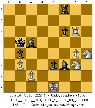 Last move : 1/2-1/2 2010 October 11 21:30:7 [Event "FICGS__CHESS__WCH_STAGE_1_GROUP_03__000008"] [Site "FICGS"] [Date "2010.07.02"] [Round "1"] [White "Schmid,Pablo"] [Black "Cade,Stephen"] [Result "1/2-1/2"] [WhiteElo "2227"] [BlackElo "1996"] 1.e4 e6 2.d4 d5 3.Nc3 Nf6 4.Bg5 Bb4 5.e5 h6 6.exf6 hxg5 7.fxg7 Rg8 8.h4 gxh4 9.Qh5 Qf6 10.Nf3 Nc6 11.Qxh4 Qxg7 12.Bb5 Bd7 13.O-O-O Be7 14.Qf4 O-O-O 15.Qe3 a6 16.Bxc6 Bxc6 17.g3 Rdf8 18.a4 Bd6 19.b3 Re8 20.Qh6 f6 21.Qxg7 Rxg7 22.Kb2 Bd7 23.Rh6 Rf7 24.Rdh1 c5 25.R6h5 Kc7 26.Nd1 b5 27.axb5 axb5 28.Ne3 b4 29.Kc1 cxd4 30.Nxd4 Bc5 31.R1h4 e5 32.Ndf5 Kc6 33.g4 Be6 34.Rh8 Ref8 35.Rxf8 Rxf8 36.Rh6 Kb5 37.Kd2 d4 38.Nf1 Bd5 39.N1g3 Bf3 40.Rg6 e4 41.Nh4 e3+ 42.fxe3 dxe3+ 43.Ke1 Bd5 44.Nhf5 Bf3 45.Nh4 1/2-1/2 French : MacCutcheon, Chigorin variation Queenside Castling by player White (move 13) Queenside Castling by player Black (move 14) This chess game ended in a draw. Follow this game move after move (download)When your house is on fire, you can't be bothered with the neighbors. Or, as we say in Chess, if your King is under attack you don't worry about losing a Pawn on the Queen's side. (Gary Kasparov) Schach ist das Spiel, das die Verrückten gesund hält. (Albert Einstein) El Ajedrez es un mar en el cual un mosquito puede beber y un elefante puede bañarse. (Refrán Hindú) Toute estimation doit être constamment réévaluée. (Jacob Estrin) Tree pose grows confidence. It roots me to this world. (Terri Guillemets)