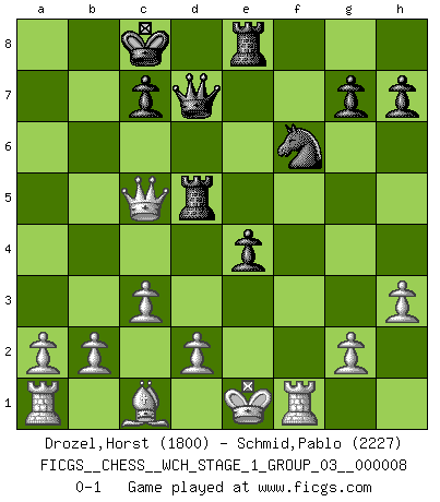 Last move : 0-1 2010 November 19 22:32:3 [Event "FICGS__CHESS__WCH_STAGE_1_GROUP_03__000008"] [Site "FICGS"] [Date "2010.07.02"] [Round "1"] [White "Drozel,Horst"] [Black "Schmid,Pablo"] [Result "0-1"] [WhiteElo "1800"] [BlackElo "2227"] 1.e4 e5 2.Nf3 Nc6 3.Bb5 f5 4.Nc3 fxe4 5.Nxe4 d5 6.Nxe5 dxe4 7.Nxc6 Qg5 8.Qe2 Nf6 9.f4 Qxf4 10.Nxa7 Bd7 11.Bxd7+ Kxd7 12.Qb5+ Ke6 13.Qxb7 Bd6 14.Qb3+ Kd7 15.Qb5+ Ke6 16.Qb3+ Kd7 17.Qf7+ Kd8 18.Nc6+ Kc8 19.Ne7+ Bxe7 20.Qxe7 Re8 21.Qc5 Ra6 22.Qe3 Qf5 23.Rf1 Qd7 24.h3 Rc6 25.c3 Rd6 26.Qc5 Rd5 0-1 This chess game has been lost on time (started : 2010.07.02 0:24:55) Ruy Lopez : Schliemann defense, Berger variation Player Black won this chess game. Follow this game move after move (download)Pawn endings are to Chess what putting is to golf. (Cecil Purdy) Wenn es im Universum noch irgendwo intelligente Lebewesen gibt, dann kennen sie Go. (Emanuel Lasker) Jugadores de primera clase pierden en contra de jugadores de segunda clase porque los jugadores de segunda clase a veces juegan una partida de primer clase. (Siegbert Tarrasch) Il n'y a plus de joueurs du niveau de Jacob Murray dont la seule quête est le beau jeu, le plaisir de voir les pièces construire quelque chose. Sur 10 idées à la minute, 9 seront sans intérêt, la dernière s'avèrera géniale. (Christian Bauer) No man has ever achieved immortality in his own life time. (Unknown)