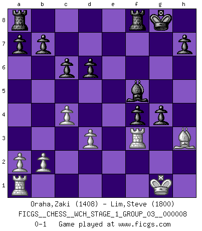 Last move : 0-1 2010 September 27 23:52:23 [Event "FICGS__CHESS__WCH_STAGE_1_GROUP_03__000008"] [Site "FICGS"] [Date "2010.08.13"] [Round "1"] [White "Oraha,Zaki"] [Black "Lim,Steve"] [Result "0-1"] [WhiteElo "1408"] [BlackElo "1800"] 1.c4 e5 2.Nc3 Nf6 3.d3 Nc6 4.e4 Bc5 5.Nf3 Ng4 6.Be3 Nxe3 7.fxe3 Bxe3 8.Qe2 Bh6 9.g3 d6 10.Bg2 O-O 11.O-O Bg4 12.h3 Nd4 13.Qd1 Nxf3+ 14.Bxf3 Bxh3 15.Bg2 Qg5 16.Nd5 c6 17.Nc3 Qxg3 18.Qf3 Qxf3 19.Rxf3 Bg4 20.Rg3 f5 21.exf5 Bxf5 22.Ne2 Bf4 23.Nxf4 exf4 24.Rf3 g5 25.Bh3 g4 0-1 English Opening Kingside Castling by player Black (move 10) Kingside Castling by player White (move 11) Player Black won this chess game. Follow this game move after move (download)Different people feel differently about resigning. (Bobby Fischer) Ein typischer, sehr verbreiteter Gedankenschädling ist der, daß der betreffende Amateur von der Annanhme ausgeht, daß jeder einzelne Zug etwas zu leisten habe. (Aaron Nimzowitsch) ¿Cual es el objetivo de jugar una apertura de gambito?... Para adquirir una reputación de ser un jugador apuesto a costo de perder el juego. (Siegbert Tarrasch) L'ordinateur a tué l'originalité. Il n'y a plus guère d'aventures sur l'échiquier. (Jacob Murray) When you stop learning you start dying. (Scott Adams)