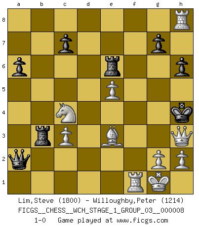 Last move : 1-0 2010 September 1 14:6:26 [Event "FICGS__CHESS__WCH_STAGE_1_GROUP_03__000008"] [Site "FICGS"] [Date "2010.08.13"] [Round "1"] [White "Lim,Steve"] [Black "Willoughby,Peter"] [Result "1-0"] [WhiteElo "1800"] [BlackElo "1214"] 1.e4 e5 2.Nf3 Nc6 3.Bc4 Nf6 4.Ng5 d5 5.exd5 Nxd5 6.d4 Bb4+ 7.c3 Be7 8.Nxf7 Kxf7 9.Qf3+ Bf6 10.Bxd5+ Kf8 11.Bxc6 bxc6 12.dxe5 Qe8 13.Bf4 Kg8 14.O-O Bd8 15.Nd2 Rb8 16.b3 h6 17.Qe4 Bb7 18.Be3 c5 19.Qc4+ Kh7 20.Qxc5 Qg6 21.f3 a6 22.Rad1 Re8 23.Nc4 Re6 24.Qa7 Bxf3 25.Rxf3 Rb5 26.Rxd8 Qb1+ 27.Rf1 Qxa2 28.Qa8 Rxb3 29.Rh8+ Kg6 30.Qe4+ Kh5 31.Qf5+ Kh4 32.Qh3+ 1-0 Two knights defense : Pincus variation Kingside Castling by player White (move 14) Player White won this chess game. Follow this game move after move (download)Chess is a cold bath for the mind. (Sir John Simon) Rubinstein ist ein Turmendspiel, welches die Götter vor tausenden von Jahren begannen. (Savielly Grigorievitsch Tartakower) El Ajedrez es el juego mas altamente simbólico, pero las agresiones estan por lo tanto aún mas francamente representadas en la partida. Tal vez comenzo como un juego de guerra; Algo como la representación de una batalla en miniatura entre las fuerzas de dos reinos. (Karl Meninger) Il vaut toujours mieux jouer un plan faux de façon logique que de n'avoir pas de plan du tout. (Victor Kortchnoï) Creativity involves breaking out of established patterns in order to look at things in a different way. (Edward De Bono)