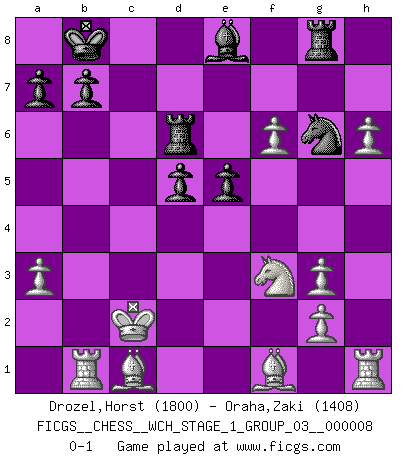 Last move : 0-1 2010 November 2 16:41:36 [Event "FICGS__CHESS__WCH_STAGE_1_GROUP_03__000008"] [Site "FICGS"] [Date "2010.07.02"] [Round "1"] [White "Drozel,Horst"] [Black "Oraha,Zaki"] [Result "0-1"] [WhiteElo "1800"] [BlackElo "1408"] 1.e4 e6 2.d4 d5 3.Nc3 Bb4 4.e5 c5 5.a3 Bxc3+ 6.bxc3 Nc6 7.Qg4 Nge7 8.Qxg7 Rg8 9.Qxh7 Qc7 10.Qd3 Bd7 11.Rb1 O-O-O 12.h4 Kb8 13.h5 Be8 14.h6 f6 15.exf6 Ng6 16.Qg3 Qxg3 17.fxg3 cxd4 18.cxd4 Nxd4 19.Nf3 Nxc2+ 20.Kd2 e5 21.Kxc2 Rd6 0-1 French : Winawer, Advance variation Queenside Castling by player Black (move 11) Player Black won this chess game. Follow this game move after move (download)Chess, like love, is infectious at any age. (Flohr) Sie bekommen vielleicht den Eindruck, dass die Spitzenspieler überhaupt gar nicht so stark sind. Aber das stimmt nicht. Es ist eine Illusion. Mit einem Computer an der Seite ist es sehr leicht, Urteile zu fällen, aber wenn man alleine am Brett sitzt, sieht die Sache ganz anders aus. (Vladimir Kramnik) Aunque la mayoría de la gente disfruta observar las partidas de los grandes Maestros de ataque, algunos de los jugadores mas notables en la historia han sido los jugadores silenciosos posicionales. Lentamente ellos te aplastan despojandote de tu espacio, congestionando tus piezas y dejandote virtualmente sin nada que hacer. (Yasser Seirawan) Vouloir jouer aux échecs contre soi-même est aussi paradoxal que vouloir marcher sur son ombre. (Stefan Zweig) I fear not the man who has practiced 10,000 kicks once, but I fear the man who has practiced one kick 10,000 times. (Bruce Lee)