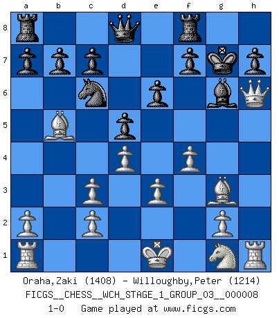 Last move : 1-0 2010 August 31 16:39:13 [Event "FICGS__CHESS__WCH_STAGE_1_GROUP_03__000008"] [Site "FICGS"] [Date "2010.08.13"] [Round "1"] [White "Oraha,Zaki"] [Black "Willoughby,Peter"] [Result "1-0"] [WhiteElo "1408"] [BlackElo "1214"] 1.d4 Nf6 2.Nc3 d5 3.Bg5 Ne4 4.Bh4 g5 5.Bg3 Nxc3 6.bxc3 Nc6 7.h4 Bh6 8.e3 Bf5 9.Bb5 O-O 10.Qh5 Kg7 11.hxg5 Bxg5 12.Qxg5+ Bg6 13.f4 e6 14.Qh6+ 1-0 Queen's pawn game Kingside Castling by player Black (move 9) Player White won this chess game. Follow this game move after move (download)Chess is as much a mystery as women. (Purdy) Kein Großmeister ist normal. Sie unterscheiden sich nur im Ausmaß Ihrer Verrücktheit. (Viktor Kortschnoi) No volvere nunca a jugar contigo. Has insultado a mi amigo. - cuando un oponente se maldijo por una mala jugada (Miguel Najdorf) À la honte des hommes, on sait que les lois du jeu sont les seules qui soient partout justes, claires, inviolables et exécutées. Pourquoi l'Indien qui a donné les règles du jeu d'échecs est-il obéi de bon gré dans toute la terre, et que les décrétales des papes, par exemple, sont aujourd'hui un objet d'horreur et de mépris ? C'est que l'inventeur des échecs combina tout avec justesse pour la satisfaction des joueurs, et que les papes, dans leurs décrétales, n'eurent en vue que leur seul avantage. L'Indien voulut exercer également l'esprit des hommes et leur donner du plaisir; les papes ont voulu abrutir l'esprit des hommes. Voltaire (Dictionnaire philosophique / Garnier 1967) Drag your thoughts away from your troubles... by the ears, by the heels, or any other way you can manage it. (Mark Twain)