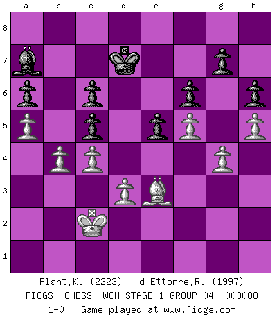 Last move : 1-0 2010 November 17 13:20:45 [Event "FICGS__CHESS__WCH_STAGE_1_GROUP_04__000008"] [Site "FICGS"] [Date "2010.07.02"] [Round "1"] [White "Plant,Kevin D."] [Black "d Ettorre,Rodolfo"] [Result "1-0"] [WhiteElo "2223"] [BlackElo "1997"] 1.e4 c5 2.f4 Nf6 3.Nc3 d5 4.exd5 Nxd5 5.Nf3 Nc6 6.Bb5 e6 7.O-O Be7 8.Bxc6+ bxc6 9.Ne5 Qc7 10.d3 O-O 11.Qe1 Rb8 12.b3 Ba6 13.Bd2 Rfe8 14.a3 Nb6 15.Qe3 f6 16.Nc4 Qd7 17.Rae1 Qd4 18.Rf2 Qxe3 19.Bxe3 Nd5 20.Bd2 Nxc3 21.Bxc3 Bxc4 22.dxc4 Kf7 23.g4 Bd8 24.Kg2 Bc7 25.Kf3 Rbd8 26.Rfe2 h6 27.h4 Rd6 28.h5 Rd7 29.Bd2 e5 30.Bc3 Rde7 31.f5 Rd7 32.Rd2 Rxd2 33.Bxd2 Rd8 34.Be3 Bb6 35.Ra1 Ke8 36.a4 a6 37.a5 Ba7 38.Ke2 Rb8 39.Rd1 Rd8 40.Rb1 Rb8 41.Bg1 Rb7 42.Rd1 Rd7 43.Rd3 Rxd3 44.cxd3 Ke7 45.Be3 Kd7 46.b4 Kd6 47.Kd2 Kd7 48.Kc2 1-0 Sicilian : Grand Prix attack Kingside Castling by player White (move 7) Kingside Castling by player Black (move 10) Player White won this chess game. Follow this game move after move (download)Life is a kind of Chess, with struggle, competition, good and ill events. (Benjamin Franklin) Ein unbeabsichtigtes Patt ist der Gipfel der Dummheit. (Anonymous) Cuando la partida de Ajedrez termina, el Peón y el Rey regresan a la misma caja. (Irish saying) Les Echecs, c'est l'art de la guerre sans les charniers, c'est la résurrection des morts tombés au champ d'honneur, l'espoir perpétuel, la suprématie de l'intelligence sur la force, la culture de l'esprit. (F. Szpiner) The greatest con, that he ever pulled... was making you believe... that he is you. (Revolver, movie)