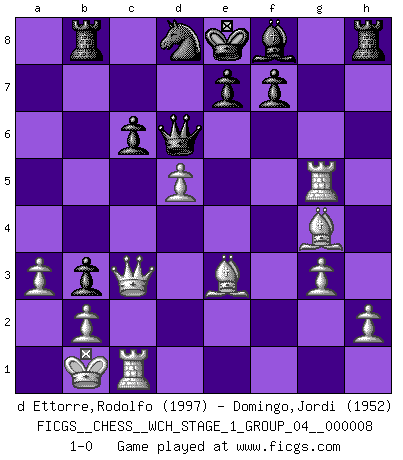 Last move : 1-0 2010 September 28 18:58:21 [Event "FICGS__CHESS__WCH_STAGE_1_GROUP_04__000008"] [Site "FICGS"] [Date "2010.07.02"] [Round "1"] [White "d Ettorre,Rodolfo"] [Black "Domingo,Jordi"] [Result "1-0"] [WhiteElo "1997"] [BlackElo "1952"] 1.Nf3 h6 2.e4 g5 3.d4 d6 4.Be3 Bg7 5.Nc3 Nf6 6.Be2 g4 7.Nh4 Nc6 8.g3 a6 9.Qd2 h5 10.O-O-O b5 11.f3 Rb8 12.Kb1 b4 13.Nd5 a5 14.Rdf1 a4 15.fxg4 hxg4 16.Nf5 Bxf5 17.Nxf6+ Bxf6 18.Rxf5 b3 19.cxb3 axb3 20.a3 Qd7 21.Bxg4 Nd8 22.Rc1 c6 23.Qc3 Qc7 24.e5 Bg7 25.Rg5 Bf8 26.exd6 Qxd6 27.d5 1-0 Reti Opening Queenside Castling by player White (move 10) Player White won this chess game. Follow this game move after move (download)The older I grow, the more I value Pawns. (Keres) Die jungen Leute sollen verstehen, dass sie noch etwas von mir lernen können und müssen. (Viktor Kortschnoi) En manos de Fischer's, una diminuta ventaja teórica es tan buena como tener una Reina de ventaja. (Isaac Kashdan) Vous n'êtes pas toujours obligé de jouer le meilleur coup. Un coup doit être actif, entreprenant, correct et beau ! (David Bronstein) Wawaweewa ! (Borat: Cultural learnings of America for make benefit glorious nation of Kazakhstan)