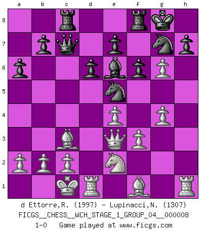 Last move : 1-0 2010 September 16 8:53:16 [Event "FICGS__CHESS__WCH_STAGE_1_GROUP_04__000008"] [Site "FICGS"] [Date "2010.07.02"] [Round "1"] [White "d Ettorre,Rodolfo"] [Black "Lupinacci,Nicola"] [Result "1-0"] [WhiteElo "1997"] [BlackElo "1307"] 1.e4 c5 2.Nf3 d6 3.d4 cxd4 4.Nxd4 Nf6 5.Nc3 a6 6.Be3 g6 7.f3 Bg7 8.Qd2 O-O 9.h4 Nh5 10.Nce2 Bxd4 11.Bxd4 Nc6 12.Bc3 Ne5 13.Qd4 f6 14.O-O-O Be6 15.Qe3 Rc8 16.g4 Ng7 17.h5 Qc7 18.hxg6 1-0 This chess game has been lost on time (started : 2010.07.02 0:27:30) Sicilian : Najdorf, Byrne (English) attack Kingside Castling by player Black (move 8) Queenside Castling by player White (move 14) Player White won this chess game. Follow this game move after move (download)When I have White, I win because I am white; When I have Black, I win because I am Bogolyubov. (Bogolyubov) Schach ist ein schwarz-weisser Dschungel. (Garry Kasparov) Del Ajedrez se ha dicho que la vida no es lo suficientemente larga para él, pero eso es culpa de la vida, no del Ajedrez. (William Ewart Napier) Il a essayé de se convaincre qu'il pourrait empêcher toutes les erreurs et ne jamais perdre. L'horreur ! Gary Kasparov au sujet de Robert Fischer. Wisdom doesn't necessarily come with age. Sometimes age just shows up all by itself. (Tom Wilson)