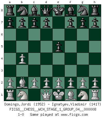 Last move : 1-0 2010 August 3 9:57:38 [Event "FICGS__CHESS__WCH_STAGE_1_GROUP_04__000008"] [Site "FICGS"] [Date "2010.07.02"] [Round "1"] [White "Domingo,Jordi"] [Black "Ignatyev,Vladimir"] [Result "1-0"] [WhiteElo "1952"] [BlackElo "1417"] 1.b4 e5 2.Bb2 1-0 This chess game has been lost on time (started : 2010.07.02 0:27:30) Polish (Sokolsky) opening Player White won this chess game. Follow this game move after move (download)Don't even mention losing to me. I can't stand to think of it. (Bobby Fischer) Ich glaube, ich kenne inzwischen die Gründe für mein Versagen: schachliche Charakterfehler. Ich war nie ein Wunderkind und in meiner gesamten menschlichen Entwicklung immer zu langsam. (Viktor Kortschnoi) En el tablero, la mentira e hipocresía no sobreviven mucho. (Emanuel Lasker) Les Echecs représentent une sphère d'idées créatrices basée sur la volonté des deux protagonistes. (Smyslov) He who defends everything defends nothing. (Frederick the Great)