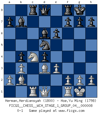 Last move : 0-1 2010 October 9 9:31:15 [Event "FICGS__CHESS__WCH_STAGE_1_GROUP_04__000008"] [Site "FICGS"] [Date "2010.08.13"] [Round "1"] [White "Herman,Herdiansyah"] [Black "Hoe,Yu Ming"] [Result "0-1"] [WhiteElo "1800"] [BlackElo "1798"] 1.d4 d5 2.c4 c6 3.Nc3 Nf6 4.Nf3 e6 5.e3 Nbd7 6.Bd3 dxc4 7.Bxc4 b5 8.Bd3 Bd6 9.O-O O-O 10.b3 b4 11.Ne4 Nxe4 12.Bxe4 Bb7 13.Bb2 Nf6 14.Bd3 c5 15.Rc1 Rc8 16.Ne5 Nd5 17.Nc4 cxd4 0-1 This chess game has been lost on time (started : 2010.08.13 14:10:10) QGD Slav defense Kingside Castling by player White (move 9) Kingside Castling by player Black (move 9) Player Black won this chess game. Follow this game move after move (download)I have always a slight feeling of pity for the man who has no knowledge of Chess. (Siegbert Tarrasch) Ich bin stolz ein Bulgare zu sein. (Veselin Topalov) Todos los Maestros de Ajedrez fueron un día unos principiantes. (Chernev) Le système Elo représente seulement une moyenne. Il est simplement un indicateur de votre stabilité. (Anatoli Karpov) The ultimate in disposing one's troops is to be without ascertainable shape. Then the most penetrating spies cannot pry in nor can the wise lay plans against you. (Sun Tzu)