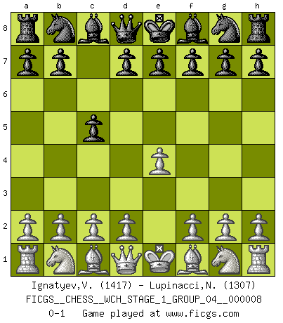 Last move : 0-1 2010 August 2 9:58:4 [Event "FICGS__CHESS__WCH_STAGE_1_GROUP_04__000008"] [Site "FICGS"] [Date "2010.07.02"] [Round "1"] [White "Ignatyev,Vladimir"] [Black "Lupinacci,Nicola"] [Result "0-1"] [WhiteElo "1417"] [BlackElo "1307"] 1.e4 c5 0-1 This chess game has been lost on time (started : 2010.07.02 0:27:30) Sicilian defense Player Black won this chess game. Follow this game move after move (download)No one ever won a game by resigning. (Unknown) Garry Kasparov war erst in der Großmeister-Organisation GMA, dann in der Profischach-Vereinigung PCA, zum Schluss kehrte er wieder in den Schoß der FIDE zurück. Aber gut, manche Leute sind flexibel (Viswanathan Anand) Las ideas audaces son como las piezas del Ajedrez que avanzan hacia adelante. Ellas pueden ser vencidas, pero también pueden iniciar una partida victoriosa. (Goethe) Les Echecs ne sont pas pour les âmes timides. Ils requièrent un homme entier, qui ne s'arrête pas aveuglément à ce qui a été déjà établi, mais qui tente individuellement de sonder les profondeurs du jeu. (W. Steinitz) If you are good, you will be assigned all the work. If you are really good, you will get out of it. (Dan Rotaru)