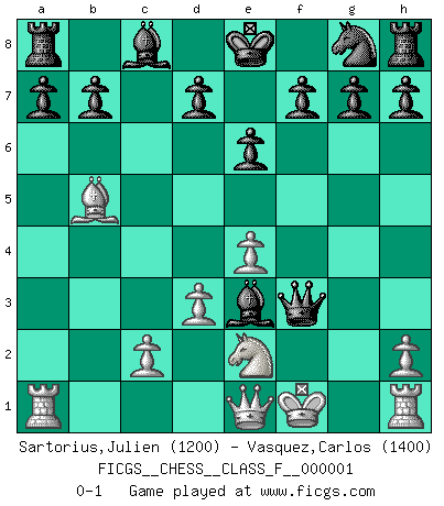 Last move : 0-1 2006 August 31 6:58:36 [Event "FICGS__CHESS__CLASS_F__000001"] [Site "FICGS"] [Date "2006.04.28"] [Round "1"] [White "Sartorius,Julien"] [Black "Vasquez,Carlos"] [Result "0-1"] [WhiteElo "1200"] [BlackElo "1400"] 1.e4 c5 2.Nc3 Nc6 3.f4 e6 4.Bb5 Nd4 5.Nf3 Nxf3+ 6.gxf3 Qh4+ 7.Kf1 Qxf4 8.a3 Be7 9.d3 Qh4 10.b4 cxb4 11.axb4 Bxb4 12.Bd2 Bc5 13.Be3 Bxe3 14.Qe1 Qf4 15.Ne2 Qxf3+ 0-1 This chess game has been lost on time (started : 2006.04.28 18:34:14) Sicilian : Grand Prix attack Player Black won this chess game. Follow this game move after move (download)The boy (then a 12 year old boy named Anatoly Karpov) doesn't have a clue about Chess, and there's no future at all for him in this profession. (Mikhail Botvinnik) Der Partner hat auch seine Existenzberechtigung. (Savielly Grigorievitsch Tartakower) Los finales de Peón son del Ajedrez lo que el cesped es del Golf. (Cecil Purdy) Ne tendez aucun piège pour le plaisir ! Ne jouez rien dans l'espoir que l'adversaire réagisse de façon stupide ! Prenez toujours pour acquis que l'adversaire va trouver le meilleur coup ! Ne jouez jamais de coup dans l'espoir que l'adversaire ne voie pas la menace ! Chacun de vos coups doit améliorer la position d'une façon ou d'une autre. However beautiful the strategy, you should occasionally look at the results. (Winston Churchill)
