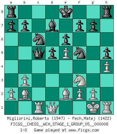 Last move : 1-0 2010 September 15 8:52:58 [Event "FICGS__CHESS__WCH_STAGE_1_GROUP_05__000008"] [Site "FICGS"] [Date "2010.07.02"] [Round "1"] [White "Migliorini,Roberto"] [Black "Pech,Matej"] [Result "1-0"] [WhiteElo "1947"] [BlackElo "1422"] 1.e4 e6 2.d4 d5 3.e5 c5 4.c3 Nc6 5.Nf3 Qb6 6.Be2 cxd4 7.cxd4 Nge7 8.b3 Nf5 9.Bb2 Bb4+ 10.Kf1 Be7 11.h4 h5 12.Nc3 Bd7 13.Na4 Qd8 14.Nc5 Bxc5 15.dxc5 Qa5 16.Kg1 Qxc5 17.Rc1 1-0 This chess game has been lost on time (started : 2010.07.02 0:29:12) French : Advance, Paulsen attack Player White won this chess game. Follow this game move after move (download)Do you realize Fischer almost never has any bad pieces? He exchanges them, and the bad pieces remain with his opponents. (Yuri Balashov) Das Schach ist nichts für kleine Geister, es beansprucht einen vollen Mann, der sich nicht sklavisch an das Überlieferte hält, sondern selbständig die Tiefen des Spiels zu ergründen sucht. (Wilhelm Steinitz) Yo siempre he tenido un ligero sentimiento de lástima por una persona que no tiene conocimiento del Ajedrez. (Siegbert Tarrasch) Même un GMI sait rarement calculer sur plus de cinq coups une attaque à sacrifices. (Rudolf Spielmann) Now be brave and don't look back. Don't look back. (Shmi Skywalker in Star Wars ep.1)