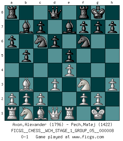 Last move : 0-1 2010 September 15 20:52:38 [Event "FICGS__CHESS__WCH_STAGE_1_GROUP_05__000008"] [Site "FICGS"] [Date "2010.07.02"] [Round "1"] [White "Axon,Alexander"] [Black "Pech,Matej"] [Result "0-1"] [WhiteElo "1796"] [BlackElo "1422"] 1.e4 e5 2.Nf3 Nc6 3.Bb5 a6 4.Ba4 Nf6 5.O-O Be7 6.Re1 b5 7.Bb3 O-O 8.h3 Bb7 9.d3 d6 0-1 This chess game has been lost on time (started : 2010.07.02 0:29:12) Ruy Lopez : Closed, 7...O-O Kingside Castling by player White (move 5) Kingside Castling by player Black (move 7) Player Black won this chess game. Follow this game move after move (download)When your house is on fire, you can't be bothered with the neighbors. Or, as we say in Chess, if your King is under attack you don't worry about losing a Pawn on the Queen's side. (Gary Kasparov) Je mehr ich von der FIDE weiss, um so weniger verstehe ich. (Alexander Kalifman) El Peón aislado arroja penumbra sobre todo el tablero. (Aaron Nimzovich) Il vaut mieux sacrifier les pièces de l'adversaire. (Xavier Tartacover) A good teacher is like a candle - it consumes itself to light the way for others. (Author unknown)