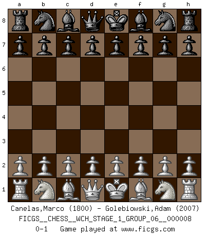 Last move : 0-1 2010 August 31 10:55:35 [Event "FICGS__CHESS__WCH_STAGE_1_GROUP_06__000008"] [Site "FICGS"] [Date "2010.07.02"] [Round "1"] [White "Canelas,Marco"] [Black "Golebiowski,Adam"] [Result "0-1"] [WhiteElo "1800"] [BlackElo "2007"] 0-1 Player Black won this chess game. Follow this game move after move (download)Many have become Chess Masters, no one has become the Master of Chess. (Siegbert Tarrasch) Ein Remis kann durch Wiederholung von drei Zügen oder durch einen schlechte Zug erreicht werden. (Savielly Grigorievitsch Tartakower) Nunca antes ha habido un jugador de Ajedrez con tal conocimiento a fondo de las complejidades del juego y una inmensa voluntad absolutamente indomable de ganar. Yo pienso que Fischer es el jugador mas grande que jamás haya existido. (Lisa Lane) Aux échecs, les retours au sommet sont rares : les dommages psychologiques consécutifs à une défaite sont trop sévères. (Daily Telegraph) The leaves of memory seemed to make a mournful rustling in the dark. (Henry Wadsworth Longfellow)