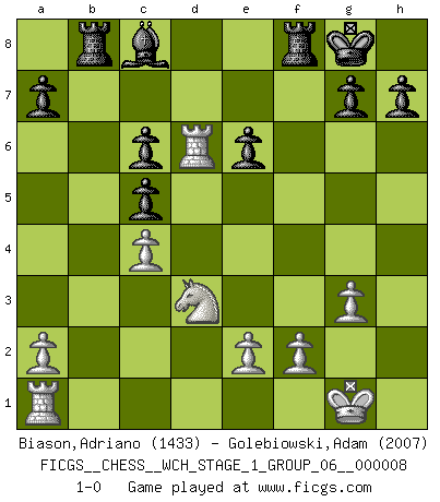 Last move : 1-0 2010 October 15 9:48:33 [Event "FICGS__CHESS__WCH_STAGE_1_GROUP_06__000008"] [Site "FICGS"] [Date "2010.07.02"] [Round "1"] [White "Biason,Adriano"] [Black "Golebiowski,Adam"] [Result "1-0"] [WhiteElo "1433"] [BlackElo "2007"] 1.d4 e6 2.c4 Nf6 3.Nf3 Bb4+ 4.Nc3 c5 5.g3 Nc6 6.Bg2 Ne4 7.Bd2 Bxc3 8.bxc3 O-O 9.O-O f5 10.dxc5 Qe7 11.Be3 Nxc3 12.Qd3 Ne4 13.Rfd1 Nxc5 14.Qa3 b6 15.Bxc5 Qxc5 16.Qxc5 bxc5 17.Ne1 f4 18.Rd6 fxg3 19.hxg3 Rb8 20.Bxc6 dxc6 21.Nd3 1-0 This chess game has been lost on time (started : 2010.07.02 0:30:53) Queen's pawn Kingside Castling by player Black (move 8) Kingside Castling by player White (move 9) Player White won this chess game. Follow this game move after move (download)With or without the title, Bobby Fischer was unquestionably the greatest player of his time. (Burt Hochberg) Ich kenne Menschen, die allen Willen der Welt besitzen und doch nicht Schach spielen können. (Robert James Fischer) El Ajedrez demanda una total concentración. (Bobby Fischer) Karpov est une pièce de musée. (Garry Kasparov) It is the aim of the modern school, not to treat every position according to one general law, but according to the principle inherent in the position. (Richard Reti)