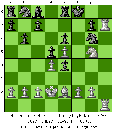 Last move : 0-1 2007 February 1 20:19:34 [Event "FICGS__CHESS__CLASS_F__000017"] [Site "FICGS"] [Date "2006.11.09"] [Round "1"] [White "Nolan,Tom"] [Black "Willoughby,Peter"] [Result "0-1"] [WhiteElo "1400"] [BlackElo "1275"] 1.e4 e6 2.d4 d5 3.Nc3 Nf6 4.Bg5 Be7 5.e5 Nfd7 6.h4 Bxg5 7.hxg5 Qxg5 8.Qd2 Qxd2+ 9.Kxd2 O-O 10.Bd3 b6 11.Bxh7 Kh8 12.Bd3 Kg8 13.Nf3 f5 14.Ng5 Re8 15.Rh7 Nf8 16.Rh5 Ng6 17.Nce4 fxe4 18.Be2 Nf4 19.Rh7 Ng6 20.Rah1 Kf8 0-1 French : Albin-Alekhine-Chatard attack Kingside Castling by player Black (move 9) Player Black won this chess game. Follow this game move after move (download)Chess, like love, like music, has the power to make people happy. (Siegbert Tarrasch) Ich kenne Menschen, die allen Willen der Welt besitzen und doch nicht Schach spielen können. (Robert James Fischer) ¿Esta Bobby Fischer algo cuerdo?. (Salo Flohr) Toutes les manuvres exécutées sur une colonne ouverte ont pour but ultime l'intrusion définitive sur la septième ou la huitième rangée, en plein cur de la position ennemie. (Aaron Nimzovitch) Life is like internet, nothing interesting, but noone want to leave it. (Ilmars Cirulis)