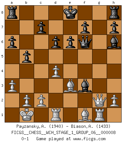 Last move : 0-1 2010 August 2 22:35:13 [Event "FICGS__CHESS__WCH_STAGE_1_GROUP_06__000008"] [Site "FICGS"] [Date "2010.07.02"] [Round "1"] [White "Payzansky,Aleksey"] [Black "Biason,Adriano"] [Result "0-1"] [WhiteElo "1940"] [BlackElo "1433"] 1.e4 g6 2.d4 d6 3.Nc3 e6 4.Be3 a6 5.Qd2 Bg7 6.O-O-O Ne7 7.f4 Nd7 8.Nf3 b5 9.a3 Bb7 10.g4 Nf6 11.f5 gxf5 12.gxf5 Nxe4 13.Nxe4 Bxe4 14.Qg2 Nxf5 15.Bf2 Qf6 16.Rg1 Bh6+ 17.Kb1 Ne3 18.Bxe3 Bxf3 0-1 Robatsch (Modern) defense Queenside Castling by player White (move 6) Player Black won this chess game. Follow this game move after move (download)Checkers is for tramps. (Paul Morphy) Wenn Capablanka heute auf der Schachbühne erscheinen würde, hätte er ein halbes Jahr gebraucht um sich die Schachtheorie anzueignen. Und dann hätte er alles und jeden besiegt. (Mikhail Moiseyevich Botvinik) No puedes jugar al Ajedrez si eres de corazón noble. (Proverbio Francés) Je ne crois pas en la psychologie, je crois aux bons coups. (Robert Fischer) The best weapon against an enemy is another enemy. (Friedrich Nietzsche)