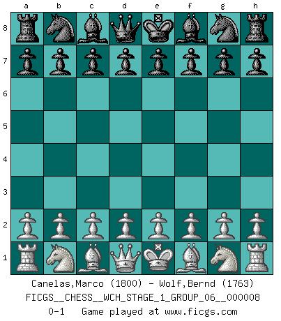 Last move : 0-1 2010 August 31 10:55:35 [Event "FICGS__CHESS__WCH_STAGE_1_GROUP_06__000008"] [Site "FICGS"] [Date "2010.07.02"] [Round "1"] [White "Canelas,Marco"] [Black "Wolf,Bernd"] [Result "0-1"] [WhiteElo "1800"] [BlackElo "1763"] 0-1 Player Black won this chess game. Follow this game move after move (download)The hallmark of the artist is simplicity. (Larry Evans) Kostenjuk hat keinen Sexappeal. (Loek van Wely) Bobby Fischer es el jugador de Ajedrez mas grande que jamás haya existido. (Ken Smith) On croit qu'il y a plus de mauvais joueurs que de bons joueurs, c'est faux : Il y a autant de joueurs qui gagnent que de joueurs qui perdent. (Philippe Geluck) A mistake is only a mistake if you let it happen twice. Otherwise it is a learning experience. (Daniel Parmet)