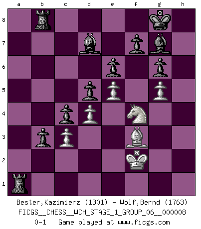 Last move : 0-1 2010 August 24 9:34:38 [Event "FICGS__CHESS__WCH_STAGE_1_GROUP_06__000008"] [Site "FICGS"] [Date "2010.07.02"] [Round "1"] [White "Bester,Kazimierz"] [Black "Wolf,Bernd"] [Result "0-1"] [WhiteElo "1301"] [BlackElo "1763"] 1.f4 d5 2.Nf3 c5 3.e3 Nc6 4.Be2 g6 5.O-O Bg7 6.c3 Nf6 7.d4 O-O 8.Nbd2 Ng4 9.Nb3 c4 10.Nbd2 Nxe3 11.Qe1 Nc2 12.Qh4 Nxa1 13.Ne5 Bf6 14.Qf2 Qa5 15.a3 Bg7 16.Ndf3 Nxe5 17.fxe5 Qb6 18.Qh4 Nb3 19.Ng5 h6 20.Nh3 Nxc1 21.Rxc1 Qxb2 22.Qe1 Qxa3 23.Nf4 e6 24.h4 a5 25.Qd2 Bd7 26.g4 b5 27.Kf2 b4 28.Bf3 b3 29.Rb1 a4 30.g5 hxg5 31.hxg5 Rfb8 32.Rb2 Qxb2 33.Qxb2 a3 34.Qb1 a2 35.Qh1 a1Q 36.Qxa1 Rxa1 0-1 Bird's Opening Kingside Castling by player White (move 5) Kingside Castling by player Black (move 7) Promotion Queen by player Black (move 35) Player Black won this chess game. Follow this game move after move (download)Fischer was a master of clarity and a king of artful positioning. His opponents would see where he was going but were powerless to stop him. (Bruce Pandolfini) Kein Schachspieler kann gut schlafen. (H. G. Wells) Cada Peón es una Reina en potencia. (James Mason) Comme les marins qui ont mille raisons différentes d'aller en mer, les joueurs d'échecs en ont tout autant avant de s'installer devant une table et jouer... (Vincent Bertignac, philosophe) Wisdom begins at the end. (Daniel Webster)