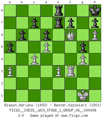 Last move : 1-0 2010 August 22 8:48:3 [Event "FICGS__CHESS__WCH_STAGE_1_GROUP_06__000008"] [Site "FICGS"] [Date "2010.07.02"] [Round "1"] [White "Biason,Adriano"] [Black "Bester,Kazimierz"] [Result "1-0"] [WhiteElo "1433"] [BlackElo "1301"] 1.d4 Nf6 2.c4 g6 3.Nf3 Bg7 4.Nc3 d6 5.e3 O-O 6.Be2 Bf5 7.O-O Nbd7 8.b3 Nb8 9.Bb2 Nc6 10.d5 Nb4 11.Qd2 a5 12.a3 Na6 13.Nd4 Nc5 14.Nxf5 Nxb3 15.Qd1 Nxa1 16.Nxg7 Kxg7 17.Ne4 Qd7 18.Bxa1 Qf5 19.g4 Qxe4 20.Bd3 Qxd3 21.Qxd3 Kg8 22.Bxf6 exf6 23.f4 Rae8 24.Rf3 b6 25.h4 Re7 26.h5 Rfe8 27.h6 g5 28.fxg5 fxg5 29.Qf5 Kh8 30.Qf6+ 1-0 King's Indian, 3.Nf3 Kingside Castling by player Black (move 5) Kingside Castling by player White (move 7) Player White won this chess game. Follow this game move after move (download)To avoid losing a piece, many a person has lost the game. (Savielly Tartakover) Auf Remis zu spielen ist gewissermaßen ein Verbrechen gegen das Schachspiel. (Mikhail Nekhemyevich Tal) Muchos se han convertido en Maestros de Ajedrez, nadie se ha convertido en el Maestro del Ajedrez. (Siegbert Tarrasch) Horreur, mais aussi harmonie suprême : qu'y avait-il en effet au monde en dehors des échecs ? Le brouillard, l'inconnu, le non-être... (Vladimir Nabokov) Man with more than one clock never knows what time it is. (Chinese thought)