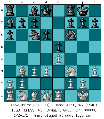 Last move : 1/2-1/2 2010 July 17 20:37:10 [Event "FICGS__CHESS__WCH_STAGE_1_GROUP_07__000008"] [Site "FICGS"] [Date "2010.07.02"] [Round "1"] [White "Panov,Dmitriy"] [Black "Hardfeldt,Pan"] [Result "1/2-1/2"] [WhiteElo "2008"] [BlackElo "1940"] 1.e4 e5 2.Nf3 Nc6 3.Bc4 Bc5 4.c3 Nf6 5.d3 d6 6.O-O a6 7.Bb3 Ba7 8.Re1 O-O 9.h3 1/2-1/2 Giuoco Piano Kingside Castling by player White (move 6) Kingside Castling by player Black (move 8) This chess game ended in a draw. Follow this game move after move (download)Help your pieces so they can help you. (Paul Morphy) Fischer ist das größte Genie, das je vom Schachhimmel heruntergestiegen ist. (Mikhail Nekhemyevich Tal) Cuando tengas duda... ¡juega al Ajedrez!. (Tevis) Aux échecs, les retours au sommet sont rares : les dommages psychologiques consécutifs à une défaite sont trop sévères. (Daily Telegraph) All politicians must be presumed guilty until they are proven innocent. (Dinesh De Silva)