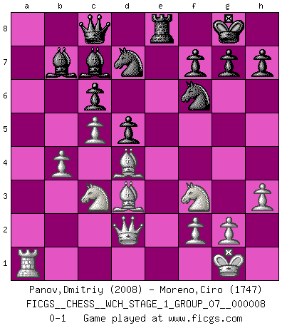 Last move : 0-1 2010 September 14 20:49:49 [Event "FICGS__CHESS__WCH_STAGE_1_GROUP_07__000008"] [Site "FICGS"] [Date "2010.07.02"] [Round "1"] [White "Panov,Dmitriy"] [Black "Moreno,Ciro"] [Result "0-1"] [WhiteElo "2008"] [BlackElo "1747"] 1.e4 e5 2.Nf3 Nf6 3.Nxe5 d6 4.Nf3 Nxe4 5.d4 d5 6.Bd3 Bd6 7.O-O O-O 8.c4 Nf6 9.c5 Be7 10.Be3 Re8 11.Nc3 b6 12.Re1 bxc5 13.dxc5 c6 14.Qd2 Ba6 15.Bc2 Bb7 16.a3 Nbd7 17.b4 a5 18.h3 axb4 19.axb4 Rxa1 20.Rxa1 Qc8 21.Bd3 Bd8 22.Bd4 Bc7 0-1 This chess game has been lost on time (started : 2010.07.02 0:32:46) Petrov : Classical attack, Marshall variation Kingside Castling by player White (move 7) Kingside Castling by player Black (move 7) Player Black won this chess game. Follow this game move after move (download)Examine moves that smite! A good eye for smites is far more important than a knowledge of strategical principles. (Purdy) In Buenos Aires ist es nicht mein vorrangiges Ziel ein starkes Turnier zu organisieren, sondern ein Turnier für Gentlemen. Ich würde nie Kamsky einladen. Ich mag keine Probleme. (Miguel Najdorf) Cada Peón es potencialmente una Reina. (James Mason) Les échecs, c'est la lutte contre l'erreur. (Johannes Zukertort) At work, the authority of a person is inversely proportional to the number of pens that person is carrying. (Dan Rotaru)