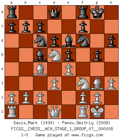 Last move : 1-0 2010 September 10 11:27:34 [Event "FICGS__CHESS__WCH_STAGE_1_GROUP_07__000008"] [Site "FICGS"] [Date "2010.07.02"] [Round "1"] [White "Davis,Mark"] [Black "Panov,Dmitriy"] [Result "1-0"] [WhiteElo "1434"] [BlackElo "2008"] 1.e4 e5 2.Nf3 Nf6 3.Nc3 Nc6 4.Bc4 Bc5 5.O-O O-O 6.d3 d6 7.Bg5 h6 8.Bh4 Bg4 9.h3 Be6 10.Nd5 g5 11.Bg3 1-0 This chess game has been lost on time (started : 2010.07.02 0:32:46) Petrov Three knights game Kingside Castling by player White (move 5) Kingside Castling by player Black (move 5) Player White won this chess game. Follow this game move after move (download)If cunning alone were needed to excel, women would be the best Chess players. (Albin) Ich hatte Angst gegen einen russischen Großmeister zu verlieren, und er befürchtete gegen einen kleinen Jungen zu verlieren. (über ein Remis gegen Juri Awerbach). (Robert James Fischer) Bobby Fischer es el jugador de Ajedrez mas grande que jamás haya existido. (Ken Smith) Il n'y a pas de prix trop élevé au scalp de l'ennemi. (Koblentz) All art requires courage. (Anne Tucker)