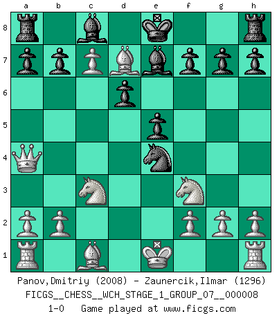 Last move : 1-0 2010 July 18 19:14:51 [Event "FICGS__CHESS__WCH_STAGE_1_GROUP_07__000008"] [Site "FICGS"] [Date "2010.07.02"] [Round "1"] [White "Panov,Dmitriy"] [Black "Zaunercik,Ilmar"] [Result "1-0"] [WhiteElo "2008"] [BlackElo "1296"] 1.e4 c5 2.c3 Nc6 3.d4 cxd4 4.cxd4 Nf6 5.d5 Nb4 6.Nc3 e5 7.Nf3 d6 8.Qa4+ Nc6 9.dxc6 Be7 10.c7 Qd7 11.Bb5 Nxe4 12.Bxd7+ 1-0 Sicilian : Alapin's variation (2.c3) Player White won this chess game. Follow this game move after move (download)During a Chess competition a Chessmaster should be a combination of a beast of prey and a monk. (Alexander Alekhine) Offensichtlich kennt Kasparow nichts anderes als Schach, und ich könnte 500 weitere Spieler dieser Sorte benennen. (Judith Polgar) Con o sin el título, Bobby Fischer fue sin lugar a dudas el mas grande jugador de su época. (Burt Hochberg) Ce qui caractérise les parties de combat, c'est que si le défenseur a constamment de difficiles problèmes à résoudre, l'attaquant doit chercher sans relâche de nouvelles possibilités d'attaque. (Koblentz) Gambling is the son of avarice and the father of despair. (French proverb)