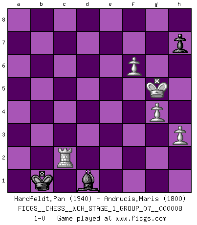 Last move : 1-0 2010 December 2 23:40:12 [Event "FICGS__CHESS__WCH_STAGE_1_GROUP_07__000008"] [Site "FICGS"] [Date "2010.07.02"] [Round "1"] [White "Hardfeldt,Pan"] [Black "Andrucis,Maris"] [Result "1-0"] [WhiteElo "1940"] [BlackElo "1800"] 1.d4 Nf6 2.Nf3 d5 3.c4 e6 4.Nc3 Nc6 5.a3 Be7 6.e3 O-O 7.Qc2 Na5 8.cxd5 exd5 9.b4 Nc6 10.b5 Nb8 11.Bd3 a6 12.O-O axb5 13.Nxb5 c6 14.Nc3 g6 15.Re1 Re8 16.Qb3 c5 17.Nxd5 Nxd5 18.Bc4 Nf6 19.Bxf7+ Kg7 20.Bxe8 Qxe8 21.Bb2 Qa4 22.Qc3 Nbd7 23.e4 c4 24.Qd2 Bd8 25.Qb4 Ra5 26.Ng5 Nb6 27.d5 Kg8 28.Bd4 Ra6 29.Rab1 Qxb4 30.Rxb4 Nfd7 31.Ne6 Be7 32.Rb5 Na8 33.Rc1 Ra4 34.e5 Kf7 35.Rc3 Bxa3 36.h3 b6 37.Rb1 Bf8 38.Nxf8 Nxf8 39.Bxb6 Bf5 40.Rb5 Nxb6 41.Rxb6 Be4 42.Rb5 Bd3 43.e6+ Nxe6 44.Rb7+ Kf6 45.dxe6 Ra1+ 46.Kh2 g5 47.e7 Re1 48.Kg3 Rxe7 49.Rxe7 Kxe7 50.Kg4 Kf6 51.Ra3 Ke5 52.Kxg5 Kd4 53.f4 c3 54.Ra1 c2 55.g4 Kc3 56.f5 Be2 57.f6 Kb2 58.Rg1 Bd1 59.Rg2 Kb1 60.Rxc2 1-0 Queen's pawn game Kingside Castling by player Black (move 6) Kingside Castling by player White (move 12) 10 pieces endgame at move 49 : White KRPPP , Black KBPPP WHITE : King + 1 Rook 3 Pawns BLACK : King + 1 Bishop 3 Pawns 9 pieces endgame at move 52 : White KRPPP , Black KBPP WHITE : King + 1 Rook 3 Pawns BLACK : King + 1 Bishop 2 Pawns 8 pieces endgame at move 60 : White KRPPP , Black KBP WHITE : King + 1 Rook 3 Pawns BLACK : King + 1 Bishop 1 Pawn Player White won this chess game. Follow this game move after move (download)In Chess, just as in life, today's bliss may be tomorrow's poison. (Assaic) Mit Schach schule ich mein Gefühl für Geometrie, was für Tennis und Schach gleichermaßen wichtig ist. (Boris Becker) El Ajedrez es una hermosa aventura. (Bent Larsen) Même un GMI sait rarement calculer sur plus de cinq coups une attaque à sacrifices. (Rudolf Spielmann) Are you threatening me, Master Jedi ? (Chancellor Palpatine in Star Wars ep.3)