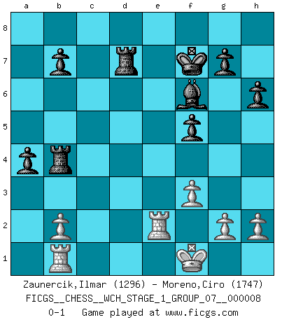 Last move : 0-1 2010 October 12 21:47:5 [Event "FICGS__CHESS__WCH_STAGE_1_GROUP_07__000008"] [Site "FICGS"] [Date "2010.07.02"] [Round "1"] [White "Zaunercik,Ilmar"] [Black "Moreno,Ciro"] [Result "0-1"] [WhiteElo "1296"] [BlackElo "1747"] 1.e4 c5 2.Nf3 e6 3.c3 d5 4.exd5 Qxd5 5.d4 Nf6 6.Nbd2 cxd4 7.Nxd4 Be7 8.Qf3 O-O 9.Qxd5 Nxd5 10.Bc4 Nb6 11.Bb3 e5 12.N4f3 Nc6 13.O-O Bd6 14.Ne4 Bc7 15.Neg5 h6 16.Ne4 Rd8 17.Re1 a5 18.a4 Bf5 19.Nc5 Nd7 20.Nxd7 Rxd7 21.Be3 Rad8 22.Bc5 Bg4 23.Bd1 e4 24.Nd4 Bxd1 25.Raxd1 Rd5 26.Rxe4 Rxc5 27.R4e1 Rcd5 28.Kf1 R8d7 29.Ke2 Nxd4+ 30.cxd4 f5 31.Kf1 Kf7 32.Rd2 Rxd4 33.Rde2 Rxa4 34.Re3 Rb4 35.R3e2 Bd8 36.f3 Bf6 37.Rb1 a4 0-1 This chess game has been lost on time (started : 2010.07.02 0:32:46) Sicilian defense Kingside Castling by player Black (move 8) Kingside Castling by player White (move 13) Player Black won this chess game. Follow this game move after move (download)Look at Garry Kasparov. After he loses, invariably he wins the next game. He just kills the next guy. That's something that we have to learn to be able to do. (Maurice Ashley) Über Karpov: Er war und ist ein Vertreter der russischen Reaktionäre. Das steckt tief in seiner Seele, wehalb ich nicht nett mit ihm umgehen kann. (Viktor Kortschnoi) Hoy en día, si tu no eres un Gran Maestro a los 14 años, es mejor que lo olvides. (Anand Viswanathan) C'est une question de caractère, Beaucoup de gens perdent leur motivation très vite. D'autres, ils sont rares, peuvent la conserver très longtemps. J'aime les échecs, encore aujourd'hui je suis heureux d'analyser des parties. J'aime toujours gagner, je déteste encore perdre. Bien jouer est important pour mon intégrité intellectuelle et morale. Et puis les échecs vivent en ce moment une période historique grâce à Internet. Ils se développent dans les systèmes éducatifs à travers le monde. Ils sortent de leur ghetto, et c'est mon rôle de mener à bien cette révolution. (Gary Kasparov) You can't play chess if you're groggy from pills. (Anatoly Karpov)