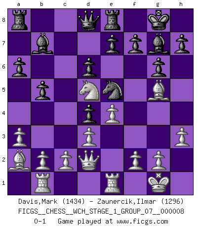 Last move : 0-1 2010 September 8 23:27:13 [Event "FICGS__CHESS__WCH_STAGE_1_GROUP_07__000008"] [Site "FICGS"] [Date "2010.07.02"] [Round "1"] [White "Davis,Mark"] [Black "Zaunercik,Ilmar"] [Result "0-1"] [WhiteElo "1434"] [BlackElo "1296"] 1.e4 c5 2.Nf3 Nc6 3.Bc4 d6 4.O-O Nf6 5.Nc3 g6 6.Re1 Bg7 7.d3 O-O 8.a3 a6 9.Bg5 b5 10.Ba2 Bb7 11.Qd2 Re8 12.Rab1 Ng4 13.Nd5 Nd4 14.Nxd4 cxd4 15.h3 Ne5 0-1 This chess game has been lost on time (started : 2010.07.02 0:32:46) Sicilian defense Kingside Castling by player White (move 4) Kingside Castling by player Black (move 7) Player Black won this chess game. Follow this game move after move (download)Chess is a beautiful mistress. (Bent Larsen) Ein Kibitz ist einer, der deinem Gegner gute Ratschläge gibt. (Andrew Soltis) El Ajedrez era la lengua materna de Capablanca. (Reti) Mon pion favori sur ma case favorite ! Bronstein en parlant d'un coup de pion en h5 quand il avait les Noirs. Internet: Absolute communication, absolute isolation. (Paul Carvel)