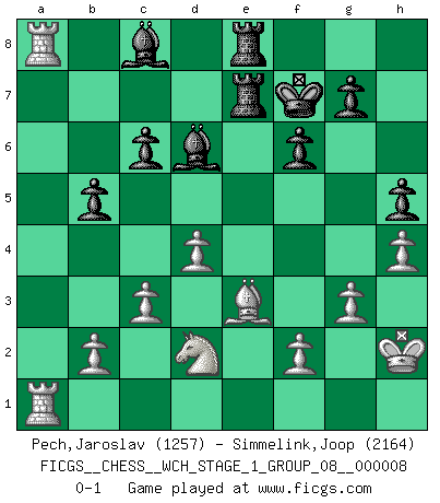 Last move : 0-1 2010 September 2 22:59:34 [Event "FICGS__CHESS__WCH_STAGE_1_GROUP_08__000008"] [Site "FICGS"] [Date "2010.07.02"] [Round "1"] [White "Pech,Jaroslav"] [Black "Simmelink,Joop"] [Result "0-1"] [WhiteElo "1257"] [BlackElo "2164"] 1.e4 e5 2.Nf3 Nc6 3.Bb5 a6 4.Ba4 Nf6 5.O-O Be7 6.Re1 b5 7.Bb3 O-O 8.c3 d5 9.exd5 Nxd5 10.Nxe5 Nxe5 11.Rxe5 c6 12.d4 Bd6 13.Re1 Qh4 14.g3 Qh3 15.Be3 Bg4 16.Qd3 Rae8 17.Nd2 Re6 18.a4 Qh5 19.axb5 axb5 20.Qf1 Rfe8 21.Bxd5 Qxd5 22.h3 Bf5 23.Qg2 h5 24.h4 Qxg2+ 25.Kxg2 R6e7 26.Kh2 Bc8 27.Ra8 f6 28.Rea1 Kf7 0-1 This chess game has been lost on time (started : 2010.07.02 0:35:21) Ruy Lopez : Closed, 7...O-O Kingside Castling by player White (move 5) Kingside Castling by player Black (move 7) Player Black won this chess game. Follow this game move after move (download)Kasparov : J'adoube , Ivanchuk : S'il vous plaît ! (Garry Kasparov & Vassily Ivanchuk, Linares 1997) Wie ich sie so einen nach dem anderen nieder mähte wurde meine Überlegenheit offensichtlich. (José Raúl Capablanca) Vive, pierde y aprende al observar a tu oponente como ganar. (Amber Steenbock) D'abord les bases : Jouez et étudiez, puis étudiez et jouez, ensuite jouez et étudiez, puis étudiez et jouez. Deuxièmement : Donnez toujours le meilleur de vous-même ! (Ken Smith) When you don't know what to do, walk fast and look worried. (Anonymous)