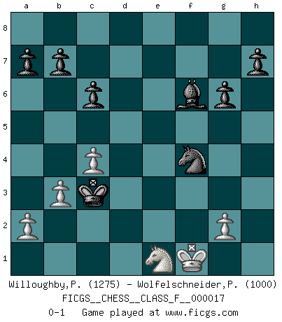 Last move : 0-1 2006 December 14 12:57:50 [Event "FICGS__CHESS__CLASS_F__000017"] [Site "FICGS"] [Date "2006.11.09"] [Round "1"] [White "Willoughby,Peter"] [Black "Wolfelschneider,Peter"] [Result "0-1"] [WhiteElo "1275"] [BlackElo "1000"] 1.e4 e5 2.f4 exf4 3.Bc4 d5 4.Bxd5 Nf6 5.Nf3 Nxd5 6.exd5 Qxd5 7.O-O Be7 8.Nc3 Qd6 9.d4 O-O 10.Qd2 g5 11.Ne5 Bf5 12.Nb5 Qd8 13.Qc3 c6 14.Na3 Qd5 15.Bd2 Nd7 16.Bxf4 gxf4 17.Rxf4 Bg6 18.Nxg6 fxg6 19.Raf1 Bg5 20.Rxf8+ Rxf8 21.b3 Rxf1+ 22.Kxf1 Bf6 23.Qe3 Bxd4 24.Qe8+ Kg7 25.Qe7+ Qf7+ 26.Qxf7+ Kxf7 27.c4 Kf6 28.h3 Nc5 29.Nc2 Ke5 30.Ke2 Ke4 31.Ne1 Ne6 32.Nf3 Nf4+ 33.Kf1 Bf6 34.Nd2+ Ke3 35.Nf3 Nxh3 36.Ne1 Nf4 37.Nc2+ Kd3 38.Ne1+ Kc3 0-1 KGA : Bishop's gambit, Morphy variation Kingside Castling by player White (move 7) Kingside Castling by player Black (move 9) Player Black won this chess game. Follow this game move after move (download)We like to think. (Gary Kasparov) Mutter, ich bin eben Ex-Weltmeister geworden. --beim nach Hause Kommen nach dem Verlust des WM-Titels an Mihail Botvinnik -- (Mikhail Nekhemyevich Tal) No puedes jugar al Ajedrez si eres de corazón noble. (Proverbio Francés) Il (Jacob Murray) ne joue pas pour le bon coup, mais pour le meilleur. (Eloi Relange) Kids, you tried your best and you failed miserably. The lesson is, never try. (Simpsons)