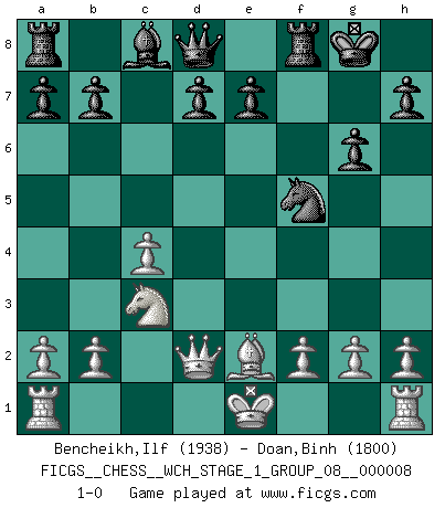 Last move : 1-0 2010 July 18 2:36:32 [Event "FICGS__CHESS__WCH_STAGE_1_GROUP_08__000008"] [Site "FICGS"] [Date "2010.07.02"] [Round "1"] [White "Bencheikh,Ilf"] [Black "Doan,Binh"] [Result "1-0"] [WhiteElo "1938"] [BlackElo "1800"] 1.e4 c5 2.Nf3 g6 3.d4 cxd4 4.Nxd4 Bg7 5.c4 Nc6 6.Be3 Nh6 7.Be2 O-O 8.Nc3 f5 9.exf5 Nxd4 10.Bxd4 Bxd4 11.Qxd4 Nxf5 12.Qd2 1-0 Sicilian : Hungarian variation Kingside Castling by player Black (move 7) Player White won this chess game. Follow this game move after move (download)The Pawns are the soul of the game. (Francois Andre Danican Philidor) Über Frauen: Chess is better. (Robert James Fischer) Los problemas de Ajedrez exigen del compositor las mismas virtudes que caracterizan todo el arte de valor: originalidad, invención, concisión, armonía, complejidad e insinceridad explendida. (Vladimir Nabokov) Il (Jacob Murray) ne joue pas pour le bon coup, mais pour le meilleur. (Eloi Relange) Control your own destiny or someone else will. (Jack Welch)
