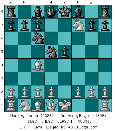 Last move : 1-0 2006 November 16 21:6:27 [Event "FICGS__CHESS__CLASS_F__000017"] [Site "FICGS"] [Date "2006.11.09"] [Round "1"] [White "Mackey,Jason"] [Black "Ducreux,Regis"] [Result "1-0"] [WhiteElo "1085"] [BlackElo "1308"] 1.e4 e5 2.Nf3 Nc6 3.Bc4 Nf6 4.Ng5 d5 5.exd5 Nxd5 6.Nxf7 1-0 Two knights defense : Fegatello attack Player White won this chess game. Follow this game move after move (download)Chess is a cold bath for the mind. (Sir John Simon) Matt entspricht nicht immer den Tatsachen. (Savielly Grigorievitsch Tartakower) La maestría del Ajedrez consiste esencialmente en analizar posiciónes de Ajedrez con precisión. (Mikhail Botvinnik) Il vaut toujours mieux jouer un plan faux de façon logique que de n'avoir pas de plan du tout. (Victor Kortchnoï) The hypothalamus is one of the most important parts of the brain, involved in many kinds of motivation, among other functions. The hypothalamus controls the 'Four Fs: Fighting, Fleeing, Feeding and Mating. (Unknown author)