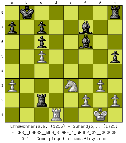 Last move : 0-1 2010 November 8 9:52:5 [Event "FICGS__CHESS__WCH_STAGE_1_GROUP_09__000008"] [Site "FICGS"] [Date "2010.07.02"] [Round "1"] [White "Chhawchharia,Gaurav"] [Black "Suhardjo,Johanes"] [Result "0-1"] [WhiteElo "1255"] [BlackElo "1729"] 1.e4 e5 2.d3 d5 3.Nf3 Nc6 4.exd5 Qxd5 5.Nc3 Qd8 6.Be3 Bg4 7.Be2 Nf6 8.Bg5 h6 9.Bxf6 Qxf6 10.Nd5 Qd6 11.c4 Be6 12.Ne3 g5 13.O-O O-O-O 14.a3 g4 15.Nd2 f5 16.Rc1 e4 17.c5 Qd7 18.dxe4 Qxd2 19.exf5 Bf7 20.Qxd2 Rxd2 21.Bxg4 h5 22.Bh3 Rxb2 23.Rfd1 Bh6 24.f6 Kb8 25.g3 Bg5 26.Bg2 Bxf6 27.Bxc6 bxc6 28.Rc2 Rxc2 0-1 This chess game has been lost on time (started : 2010.07.02 0:38:34) Variation Indian Opening : Indian Opening Kingside Castling by player White (move 13) Queenside Castling by player Black (move 13) Player Black won this chess game. Follow this game move after move (download)Chess mastery essentially consists of analyzing Chess positions accurately. (Mikhail Botvinnik) Ich war zu klein für die Schach-Schülermannschaft! (Woody Allen) En la perfecta combinación de Ajedrez como en una historia corta de primera clase, toda la trama y contra trama deberá conducir hacia un final sorprendente, el interes no es mitigado hasta el último momento. (Yates and Winter) Les échecs sont utiles à l'exercice de la faculté de penser et à celle de l'imagination. Car nous devons posséder une méthode élaborée pour atteindre des buts partout où nous devons conduire notre raison. (Leibnitz) There is a very easy way to return from a casino with a small fortune : go there with a large one. (Jack Yelton)