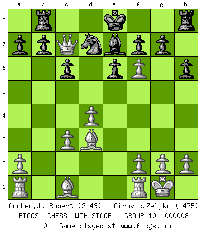 Last move : 1-0 2010 August 13 15:16:28 [Event "FICGS__CHESS__WCH_STAGE_1_GROUP_10__000008"] [Site "FICGS"] [Date "2010.07.02"] [Round "1"] [White "Archer,J. Robert"] [Black "Cirovic,Zeljko"] [Result "1-0"] [WhiteElo "2149"] [BlackElo "1475"] 1.d4 d5 2.c4 c6 3.Nf3 Nf6 4.Nc3 h6 5.cxd5 Nxd5 6.e4 Nxc3 7.bxc3 Bg4 8.Bd3 Bxf3 9.Qxf3 e6 10.O-O Qf6 11.Qg3 Nd7 12.Qc7 Be7 13.e5 Rb8 14.exf6 1-0 QGD Slav : 4.Nc3 Kingside Castling by player White (move 10) Player White won this chess game. Follow this game move after move (download)Chess is in its essence a game, in its form an art, and in its execution a science. (Baron Tassilo) Schach ist Kampf, hauptsächlich jedoch gegen die eigenen Fehler. (Savielly Grigorievitsch Tartakower) Los Peones son el alma de una partida de Ajedrez. (Francois Andre Danican Philidor) C'est la seule position que je connaisse où les deux camps sont mals. Propos prêtés à V. Anand. He who laughs last probably does not get the joke. (Unknown)