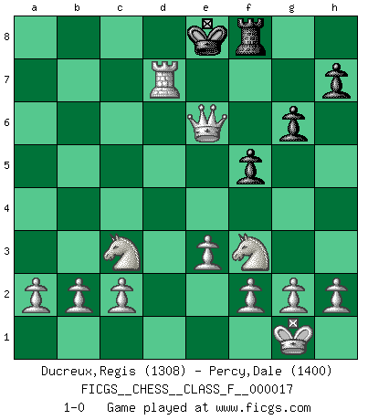 Last move : 1-0 2006 December 21 2:50:19 [Event "FICGS__CHESS__CLASS_F__000017"] [Site "FICGS"] [Date "2006.11.09"] [Round "1"] [White "Ducreux,Regis"] [Black "Percy,Dale"] [Result "1-0"] [WhiteElo "1308"] [BlackElo "1400"] 1.d4 e5 2.dxe5 Nc6 3.Nf3 Qe7 4.Bf4 Qc5 5.Nc3 Nge7 6.e3 d6 7.exd6 cxd6 8.Bxd6 Qf5 9.Bd3 g6 10.Bxf5 Nxf5 11.Bxf8 Rxf8 12.O-O Be6 13.Qe2 Rd8 14.Rfd1 f6 15.Rxd8+ Nxd8 16.Qb5+ Bd7 17.Qc5 Ne6 18.Qxa7 Nc7 19.Qb8+ Ke7 20.Qxc7 Ke8 21.Qxb7 Nd6 22.Qb8+ Nc8 23.Rd1 Bc6 24.Qxc8+ Ke7 25.Qxc6 f5 26.Rd7+ Ke8 27.Qe6+ 1-0 Queen's pawn : Charlick (Englund) gambit Kingside Castling by player White (move 12) Player White won this chess game. Follow this game move after move (download)Good positions don't win games, good moves do. (Gerald Abrahams) Ein guter Spieler hat immer Glück. (José Raúl Capablanca) El Ajedrez es la vida. (Bobby Fischer) En blitz, le Cavalier l'emporte sur le Fou. (Vlastimil Hort) Do not put your faith in what statistics say until you have carefully considered what they do not say. (William W. Watt)