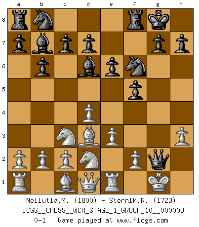 Last move : 0-1 2010 July 8 23:18:40 [Event "FICGS__CHESS__WCH_STAGE_1_GROUP_10__000008"] [Site "FICGS"] [Date "2010.07.02"] [Round "1"] [White "Nellutla,Manobhiram"] [Black "Sternik,Ryszard"] [Result "0-1"] [WhiteElo "1800"] [BlackElo "1723"] 1.d4 f5 2.e3 Nf6 3.Be2 e6 4.Nf3 b6 5.O-O Bd6 6.Nc3 O-O 7.Bd3 Bb7 8.Nd2 Qe8 9.Re1 Qg6 10.h3 Qxg2+ 0-1 Dutch Kingside Castling by player White (move 5) Kingside Castling by player Black (move 6) Player Black won this chess game. Follow this game move after move (download)You cannot play at Chess if you are kind-hearted. (French Proverb) Als ich elf wurde, wurde ich einfach gut. (Robert James Fischer) El Ajedrez es imaginación. (David Bronstein) Echiquier : carré parfait, comme la Jérusalem nouvelle décrite par l'auteur de l'Apocalypse, huit cases sur huit, exaltation du chiffre 4, symbole du cosmos aux quatre horizons... où le noir et le blanc, l'ombre et la lumière, le mal et le bien s'entremêlent et se conjuguent. (Robert Couffignal, Le Gambit du poète) My poor ole parrot... Is not in the circulation of displays ....poo hoo hoo :) (Wayne Lowrance's enigma)