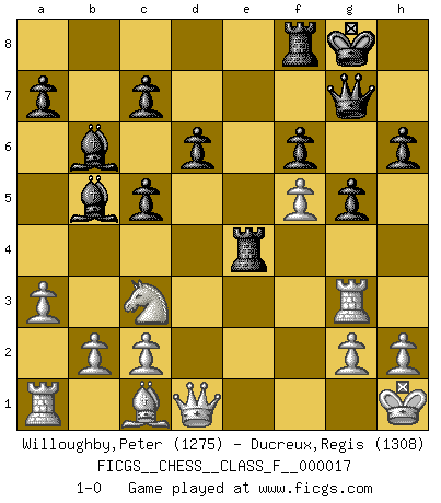 Last move : 1-0 2006 December 3 22:3:14 [Event "FICGS__CHESS__CLASS_F__000017"] [Site "FICGS"] [Date "2006.11.09"] [Round "1"] [White "Willoughby,Peter"] [Black "Ducreux,Regis"] [Result "1-0"] [WhiteElo "1275"] [BlackElo "1308"] 1.e4 e5 2.f4 Nc6 3.Bc4 Nf6 4.Nc3 Bb4 5.Nge2 O-O 6.O-O d6 7.Nd5 Nxd5 8.Bxd5 Be6 9.Bxc6 bxc6 10.a3 Ba5 11.f5 Bd7 12.d4 exd4 13.Nxd4 c5 14.Nb3 Bb6 15.Kh1 f6 16.Nd2 Bc6 17.Qg4 Qe7 18.Re1 Bd7 19.Nc4 g5 20.Re3 Qg7 21.Rg3 h6 22.Qd1 Bb5 23.Ne3 Rae8 24.Nd5 Rxe4 25.Nc3 1-0 King's gambit Kingside Castling by player Black (move 5) Kingside Castling by player White (move 6) Player White won this chess game. Follow this game move after move (download)There are two classes of men; those who are content to yield to circumstances and who play whist; those who aim to control circumstances, and who play Chess. (Mortimer Collins) Sie führen leise Selbstgespräche, schlürfen lautstark ihre Getränke, schmatzen hörbar beim Essen, blasen ihrem Gegenüber Rauch in die Augen, niesen ihm ins Gesicht, starren ihn unverwandt an, bis er sich unter ihren Blicken windet, rutschen ständig auf ihrem Stuhl hin und her, rülpsen und bohren in der Nase. (Anonymous) Todo se encuentra en un estado de flujo y esto incluye al mundo del Ajedrez. (Mikhail Botvinnik) Soyez une menace à chaque fois que vous vous asseyez pour jouer. (Ken Smith) Chess is as much a mystery as women. (Purdy)