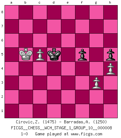 Last move : 1-0 2010 September 16 13:49:16 [Event "FICGS__CHESS__WCH_STAGE_1_GROUP_10__000008"] [Site "FICGS"] [Date "2010.07.02"] [Round "1"] [White "Cirovic,Zeljko"] [Black "Barradas,Anderson"] [Result "1-0"] [WhiteElo "1475"] [BlackElo "1250"] 1.e4 c5 2.b4 b6 3.bxc5 bxc5 4.Nc3 e6 5.Nf3 Nc6 6.d4 d6 7.dxc5 dxc5 8.Bb5 Bb7 9.Bxc6+ Bxc6 10.Qxd8+ Rxd8 11.Ba3 Be7 12.Ne5 Bb7 13.f3 Nf6 14.Na4 Nd7 15.Nxd7 Rxd7 16.Bxc5 Bxc5 17.Nxc5 Rc7 18.Nxb7 Rxb7 19.O-O-O O-O 20.Rd3 Rfb8 21.Rb3 Rxb3 22.axb3 Rb5 23.Rd1 Kf8 24.Rd3 a5 25.Kb2 Ke7 26.c4 Rb6 27.Kc3 g6 28.Rd2 f5 29.exf5 gxf5 30.Ra2 Ra6 31.b4 axb4+ 32.Kb3 Rxa2 33.Kxa2 Kd6 34.Kb3 Kc5 35.f4 h6 36.h4 h5 37.g3 Kd4 38.Kxb4 e5 39.fxe5 Kxe5 40.c5 Kd5 41.Kb5 1-0 Sicilian : wing gambit Queenside Castling by player White (move 19) Kingside Castling by player Black (move 19) 10 pieces endgame at move 33 : White KPPPP , Black KPPPP WHITE : King + 4 Pawns BLACK : King + 4 Pawns 9 pieces endgame at move 38 : White KPPPP , Black KPPP WHITE : King + 4 Pawns BLACK : King + 3 Pawns 8 pieces endgame at move 39 : White KPPPP , Black KPP WHITE : King + 4 Pawns BLACK : King + 2 Pawns 7 pieces endgame at move 39 : White KPPP , Black KPP WHITE : King + 3 Pawns BLACK : King + 2 Pawns Player White won this chess game. Follow this game move after move (download)Suddenly it was obvious to me in my analysis I had missed what Fischer had found with the greatest of ease at the board. (Mikhail Botvinnik) Kombinieren und Schwarzhandel gehören verboten. (Savielly Grigorievitsch Tartakower) Si tu oponente te ofrece un empate, trata de averiguar porque piensa él que esta en una posición peor. (Nigel Short) Seul un grand joueur sait à quel point il joue faiblement. (Xavier Tartacover) First of all, we have to go back to the classical time control. (Anatoly Karpov)