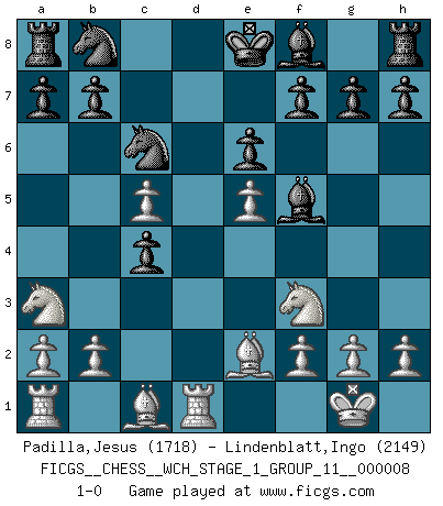 Last move : 1-0 2010 September 30 0:10:9 [Event "FICGS__CHESS__WCH_STAGE_1_GROUP_11__000008"] [Site "FICGS"] [Date "2010.08.13"] [Round "1"] [White "Padilla,Jesus"] [Black "Lindenblatt,Ingo"] [Result "1-0"] [WhiteElo "1718"] [BlackElo "2149"] 1.e4 c6 2.d4 d5 3.e5 Bf5 4.Nf3 e6 5.Be2 Ne7 6.O-O c5 7.c4 dxc4 8.Na3 Nec6 9.dxc5 Qxd1 10.Rxd1 1-0 Caro-Kann : Advance variation Kingside Castling by player White (move 6) Player White won this chess game. Follow this game move after move (download)A bad plan is better than none at all. (Frank Marshall) Schach ist Leben. (Robert James Fischer) El arma más poderosa en el Ajedrez, es tener la próxima movida. (David Bronstein) 'L'échange des dames est un coup dur pour les deux adversaires...' Un journaliste lors d'une partie du match Spassky-Fischer Begin at the beginning and go on till you come to the end; then stop. (Lewis Carrol, Alice in Wonderland)