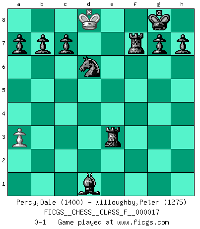 Last move : 0-1 2006 December 22 17:55:57 [Event "FICGS__CHESS__CLASS_F__000017"] [Site "FICGS"] [Date "2006.11.09"] [Round "1"] [White "Percy,Dale"] [Black "Willoughby,Peter"] [Result "0-1"] [WhiteElo "1400"] [BlackElo "1275"] 1.e4 e6 2.d3 d5 3.Ne2 dxe4 4.Nd2 exd3 5.cxd3 Bb4 6.Nf4 Nf6 7.Qe2 O-O 8.g3 Nc6 9.a3 Bxd2+ 10.Qxd2 e5 11.Qc3 exf4 12.Bxf4 Nd5 13.Qc4 Re8+ 14.Be2 Nxf4 15.Qxf4 Qxd3 16.Qd2 Bf5 17.O-O Qxd2 18.Rad1 Qxe2 19.Rde1 Qxe1 20.Rxe1 Rxe1+ 21.Kg2 Rb1 22.f3 Rxb2+ 23.Kf1 Rd8 24.Ke1 Bc2 25.Kf2 Ne5 26.f4 Nc4 27.Kf3 f5 28.Kg2 Bd1 29.Kh3 Rd6 30.Kh4 Rxh2+ 31.Kg5 Rg6+ 32.Kxf5 Nd6+ 33.Ke5 Rxg3 34.f5 Rf2 35.Ke6 Rxf5 36.Kd7 Rf7+ 37.Kd8 Re3 0-1 French : King's Indian attack Kingside Castling by player Black (move 7) Kingside Castling by player White (move 17) Player Black won this chess game. Follow this game move after move (download)As one by one I mowed them down, my superiority soon became apparent. (Jose Capablanca) Sitze auf Deine Hände. (Siegbert Tarrasch) Cada Peón es una Reina en potencia. (James Mason) Les échecs sont un jeu terrible. Si vous n'avez pas le centre, votre adversaire a une position plus libre. Par contre, si vous avez le centre, alors vous avez vraiment quelque chose pour laquelle vous inquiéter ! (Siegbert Tarrasch) Wisdom begins at the end. (Daniel Webster)