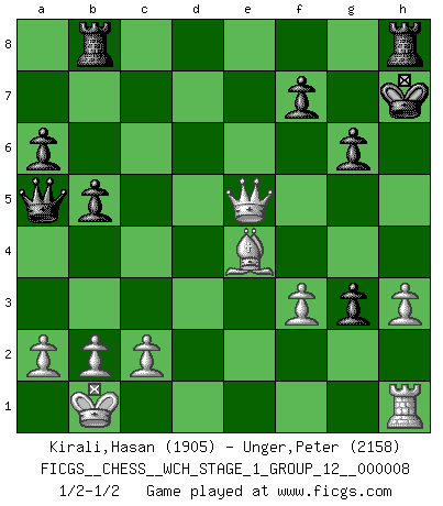 Last move : 1/2-1/2 2010 October 5 15:37:34 [Event "FICGS__CHESS__WCH_STAGE_1_GROUP_12__000008"] [Site "FICGS"] [Date "2010.08.13"] [Round "1"] [White "Kirali,Hasan"] [Black "Unger,Peter"] [Result "1/2-1/2"] [WhiteElo "1905"] [BlackElo "2158"] 1.e4 c5 2.Nf3 d6 3.d4 cxd4 4.Nxd4 Nf6 5.Nc3 a6 6.Be3 e5 7.Nb3 Be6 8.f3 h5 9.Qd2 Nbd7 10.O-O-O Be7 11.Kb1 b5 12.Nd5 Bxd5 13.exd5 Nb6 14.Bxb6 Qxb6 15.Na5 Rc8 16.Bd3 Nxd5 17.Bf5 Rb8 18.Qxd5 Qxa5 19.Qc6+ Kf8 20.Rxd6 g6 21.Be4 Bxd6 22.Qxd6+ Kg7 23.Qxe5+ Kh7 24.g4 hxg4 25.h3 g3 1/2-1/2 Sicilian : Najdorf, Byrne (English) attack Queenside Castling by player White (move 10) This chess game ended in a draw. Follow this game move after move (download)The most important feature of the Chess position is the activity of the pieces. This is absolutely fundamental in all phases of the game: Opening, Middlegame and especially Endgame. The primary constraint on a piece's activity is the Pawn structure. (Michael Stean) Wie kann ich Remis annehmen? Ich weiß ja gar nicht, wie ich stehe! (Fritz Sämisch) El Ajedrez es el juego mas altamente simbólico, pero las agresiones estan por lo tanto aún mas francamente representadas en la partida. Tal vez comenzo como un juego de guerra; Algo como la representación de una batalla en miniatura entre las fuerzas de dos reinos. (Karl Meninger) Le temps de noter son nom sur la feuille de partie, j'étais déjà en zeitnot ! D'un modeste amateur apparié lors de la première ronde d'un open contre le grand-maître Azmaïparashvili. The real danger is not that computers will begin to think like men, but that men will begin to think like computers. (Sydney J. Harris)