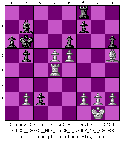 Last move : 0-1 2010 September 21 9:13:42 [Event "FICGS__CHESS__WCH_STAGE_1_GROUP_12__000008"] [Site "FICGS"] [Date "2010.08.13"] [Round "1"] [White "Denchev,Stanimir"] [Black "Unger,Peter"] [Result "0-1"] [WhiteElo "1696"] [BlackElo "2158"] 1.d4 Nf6 2.Nf3 d5 3.c4 c6 4.Nc3 e6 5.Bg5 h6 6.Bh4 dxc4 7.e3 b5 8.a4 Bb4 9.Be2 Bb7 10.O-O a6 11.Ne5 Nbd7 12.Bf3 Nxe5 13.dxe5 Qxd1 14.Rfxd1 Nd5 15.Ne4 Kd7 16.Nf6+ gxf6 17.Bxf6 Kc7 18.Bxh8 Rxh8 19.Bh5 Rf8 20.axb5 cxb5 21.Rd4 Kb6 22.Rad1 c3 23.e4 Bc5 24.exd5 Bxd4 25.Rxd4 c2 0-1 Queen's pawn game Kingside Castling by player White (move 10) Player Black won this chess game. Follow this game move after move (download)Fischer, who may or may not be mad as a hatter, has every right to be horrified. (Jeremy Silman) Wenn ich Weiß habe gewinne ich weil ich Weiß habe, wenn ich Schwarz habe gewinne ich weil ich Bogoljubov bin. (Efim Bogoljubov) Yo no le temo a Spassky. Todos saben que yo soy el mejor. Uno no necesita un torneo para probarlo. (Bobby Fischer) On entre au jeu d'Echecs comme on entre en Religion. Pour le joueur d'Echecs, la partie d'Echecs c'est l'office, la messe, le défilé du 1er Mai, le dépôt de gerbe au Monument aux Morts. C'est un drame sacré. (Michel Roos) The leaves of memory seemed to make a mournful rustling in the dark. (Henry Wadsworth Longfellow)
