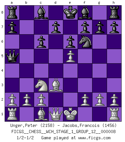 Last move : 1/2-1/2 2010 August 28 18:27:59 [Event "FICGS__CHESS__WCH_STAGE_1_GROUP_12__000008"] [Site "FICGS"] [Date "2010.08.13"] [Round "1"] [White "Unger,Peter"] [Black "Jacobs,Francois"] [Result "1/2-1/2"] [WhiteElo "2158"] [BlackElo "1456"] 1.e4 c5 2.Nf3 e6 3.d4 cxd4 4.Nxd4 Nc6 5.Nxc6 bxc6 6.Bd3 Nf6 7.e5 Qa5+ 8.Nc3 1/2-1/2 Sicilian defense This chess game ended in a draw. Follow this game move after move (download)Half the variations which are calculated in a tournament game turn out to be completely superfluous. Unfortunately, no one knows in advance which half. (Jan Tinman) Der 70jährige Viktor Kortschnoi: Die Rentenanstalt wollte mich zwingen in Rente zu gehen. Meine Frau erhält jetzt eine Pension- und ich zahle weiter in die Rentenkasse ein! (Viktor Kortschnoi) Tu sabes que vas a perder. Aún cuando tenía la ventaja, yo sabía que iba a perder. - al estar jugando con Fischer (Andrew Soltis) Toute estimation doit être constamment réévaluée. (Jacob Estrin) Warrior pose battles inner weakness and wins focus. You see that there is no war within you. You're on your own side, and you are your own strength. (Terri Guillemets)